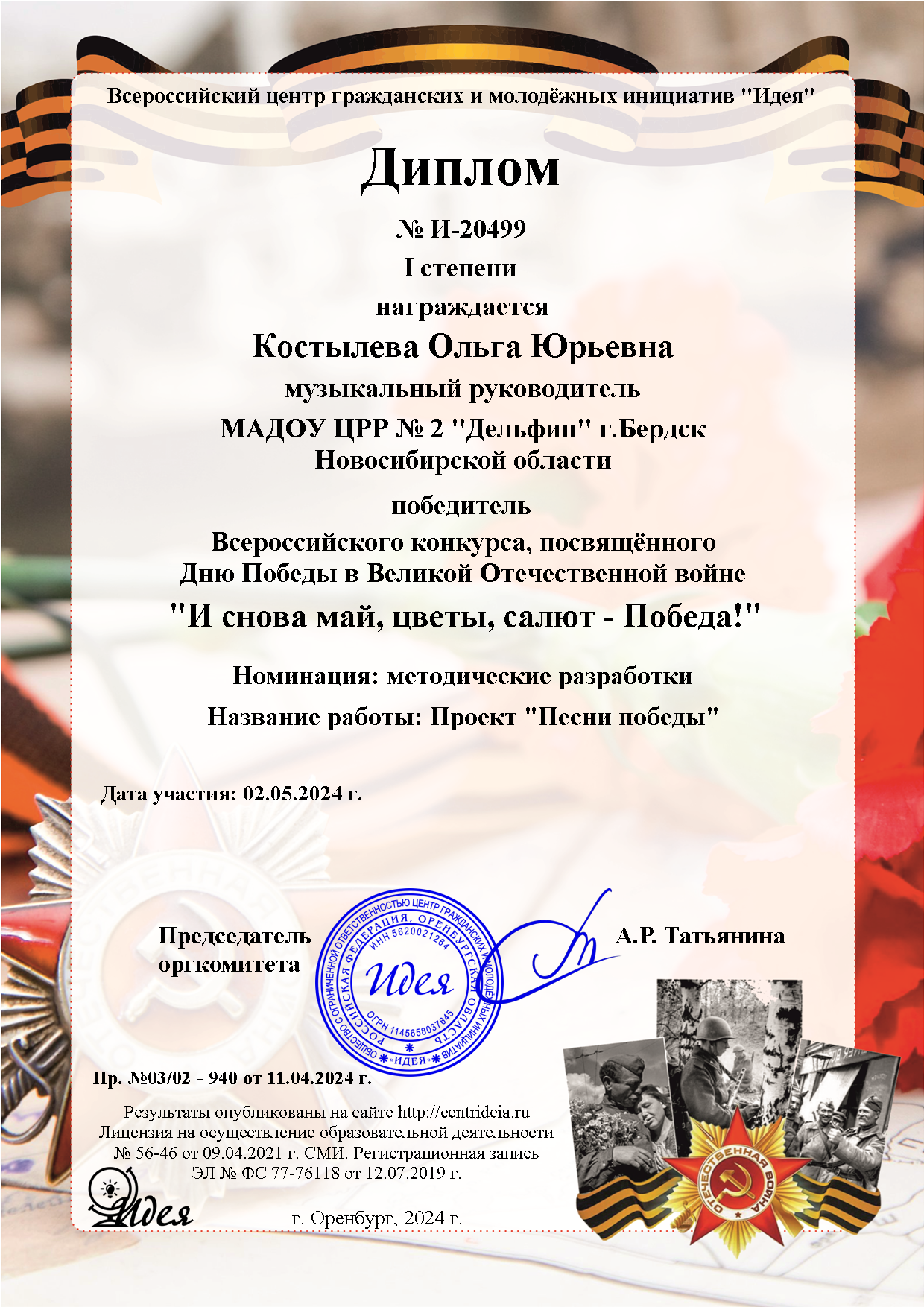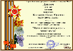 За победу во Всероссийском конкурсе, посвящённом Дню Победы в Великой Отечественной войне "И снова Май, цветы, салют - Победа!" (в номинации "Методическая разработка" за проект "Песни войны") |