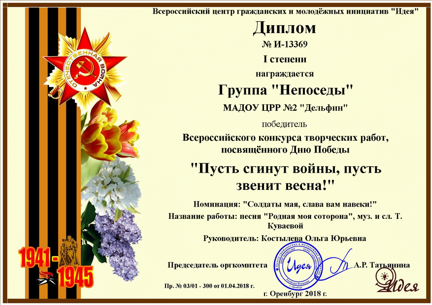 Награждается группа "Непоседы" МАДОУ ЦРР № 2 "Дельфин" - победитель во Всеросскийском конкурсе творческих работ, посвященного Дню Победы "Пусть сгинут войны, пусть звенит весна!" (Номинация: "Солдаты мая, слава вам навеки!". Песня "Родная моя сторона", муз. и сл. Т. Куваевой. Руководитель: Костылева О. Ю.)