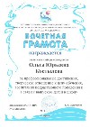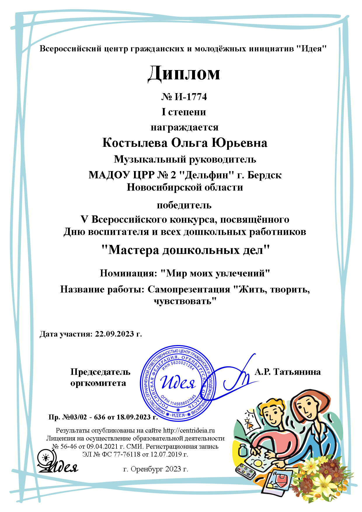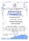 За победу в V Всероссийском конкурсе, посвящённом Дню воспитателя и всех дошкольных работников "Мастера дошкольных дел" в номинации "Мир моих увлечений" за самопрезентацию "Жить, творить, чувствовать" |
