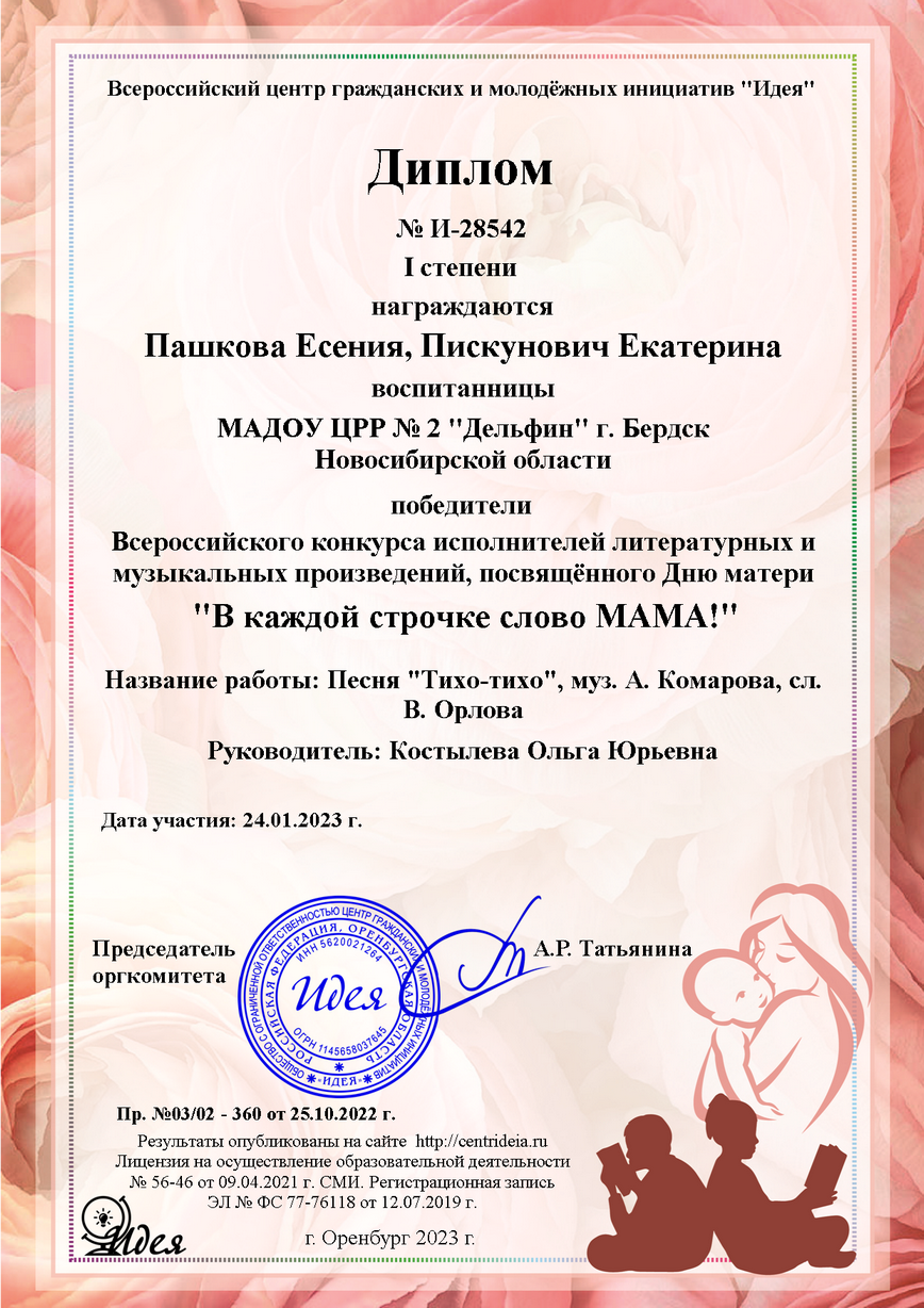Диплом I степени и Благодарственное письмо Всероссийского центра гражданских и молодёжных инициатив "Идея",