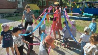 Начался праздник с торжественной линейки, в которой приняли участие все дети ДОУ (кроме самых маленьких дошколят), их родители и педагоги. Был поднят Флаг Российской Федерации, исполнен Гимн, дети старших и подготовительных к школе групп прочли стихи о школе, детском саде, знаниях и о городе (в преддверии Дня Города). Руководитель учреждения, Щербакова Татьяна Анатольевна, поздравила всех с началом учебного года, пожелала успехов, новых знаний, дружных игр и провела перекличку групп. Затем праздничные мероприятия продолжились с стенах детского сада.