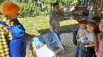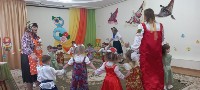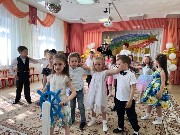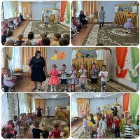 Хозяюшке. Помогли убрать ей двор от осенних листьев, познакомились с обитателями двора: котом Барсиком, Петушком, Козочкой с Козлёнком. Ребята с персонажами пели, играли и танцевали. В конце дошколят ждало угощение от Козы и Хозяюшки.